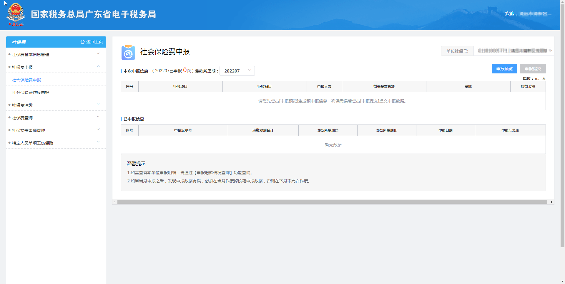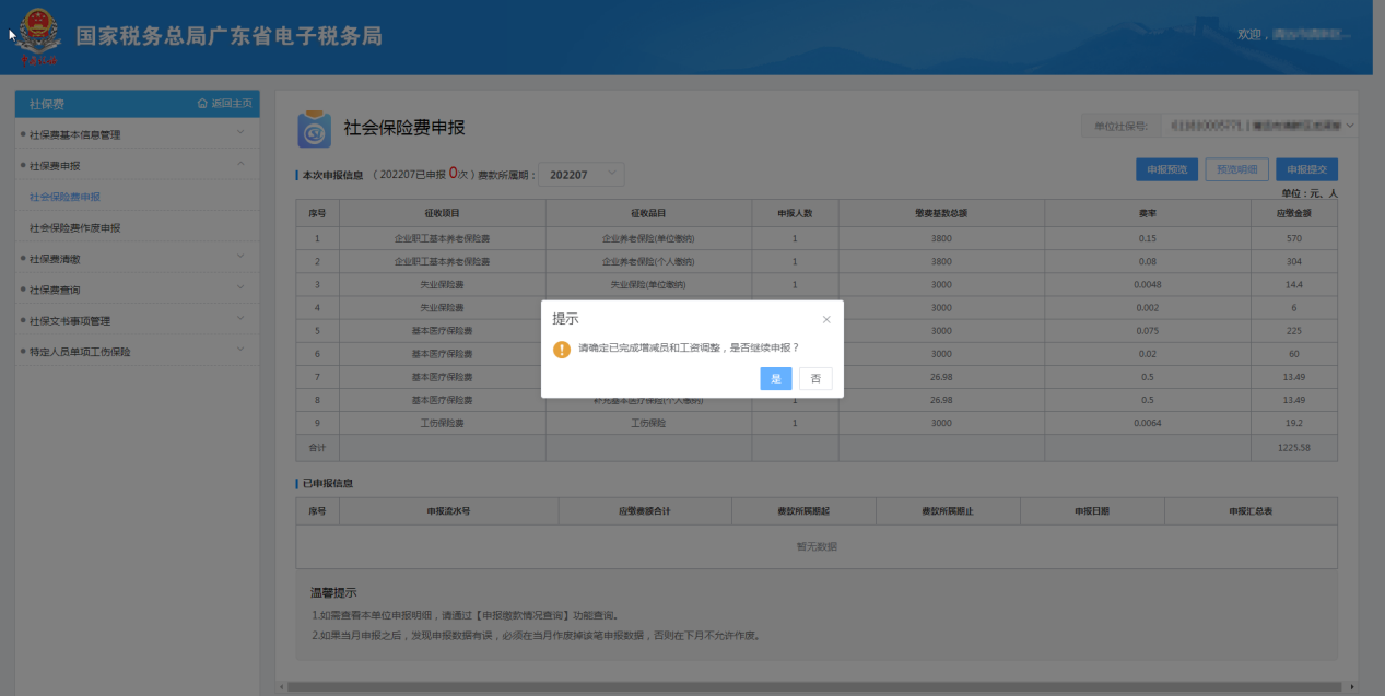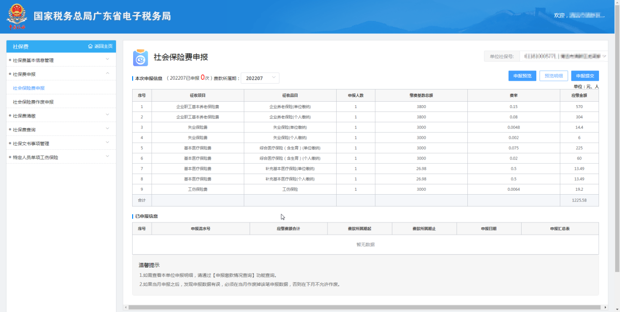 【本次申報(bào)信息】:預(yù)覽展示當(dāng)前社會保險(xiǎn)費(fèi)申報(bào)的匯總信息;