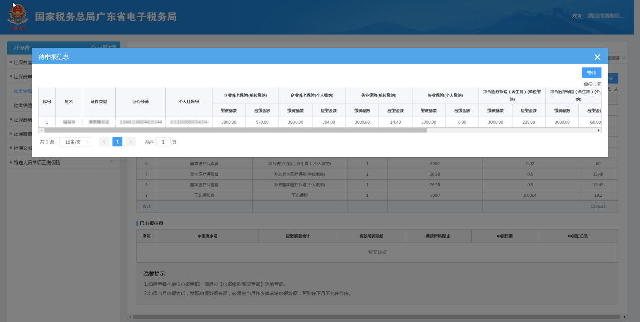 待申報(bào)明細(xì)信息窗口,點(diǎn)擊【導(dǎo)出】可將待申報(bào)信息導(dǎo)出本地;