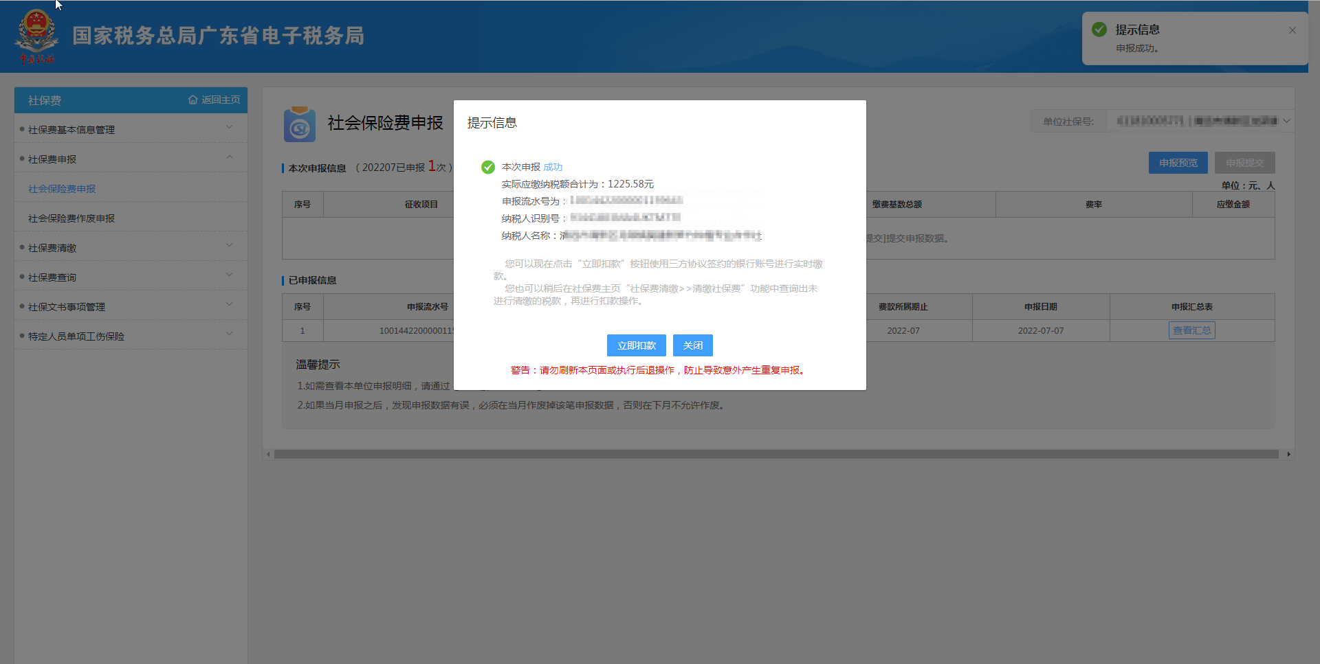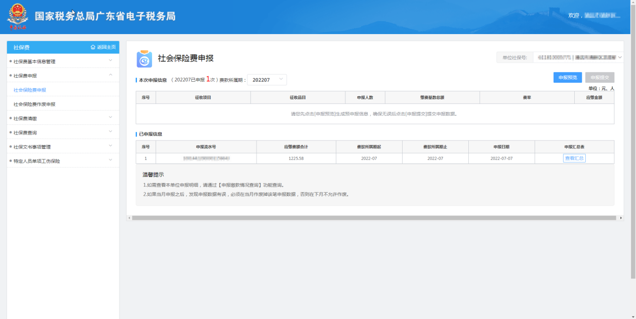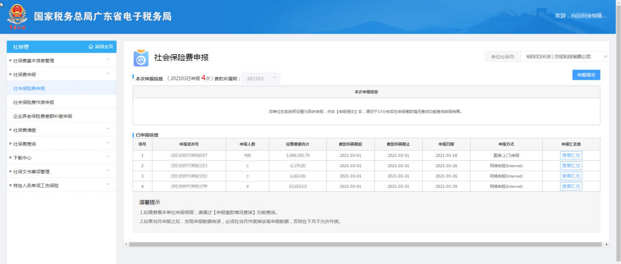 【申報(bào)提交】:提交申報(bào)社會保險(xiǎn)費(fèi);