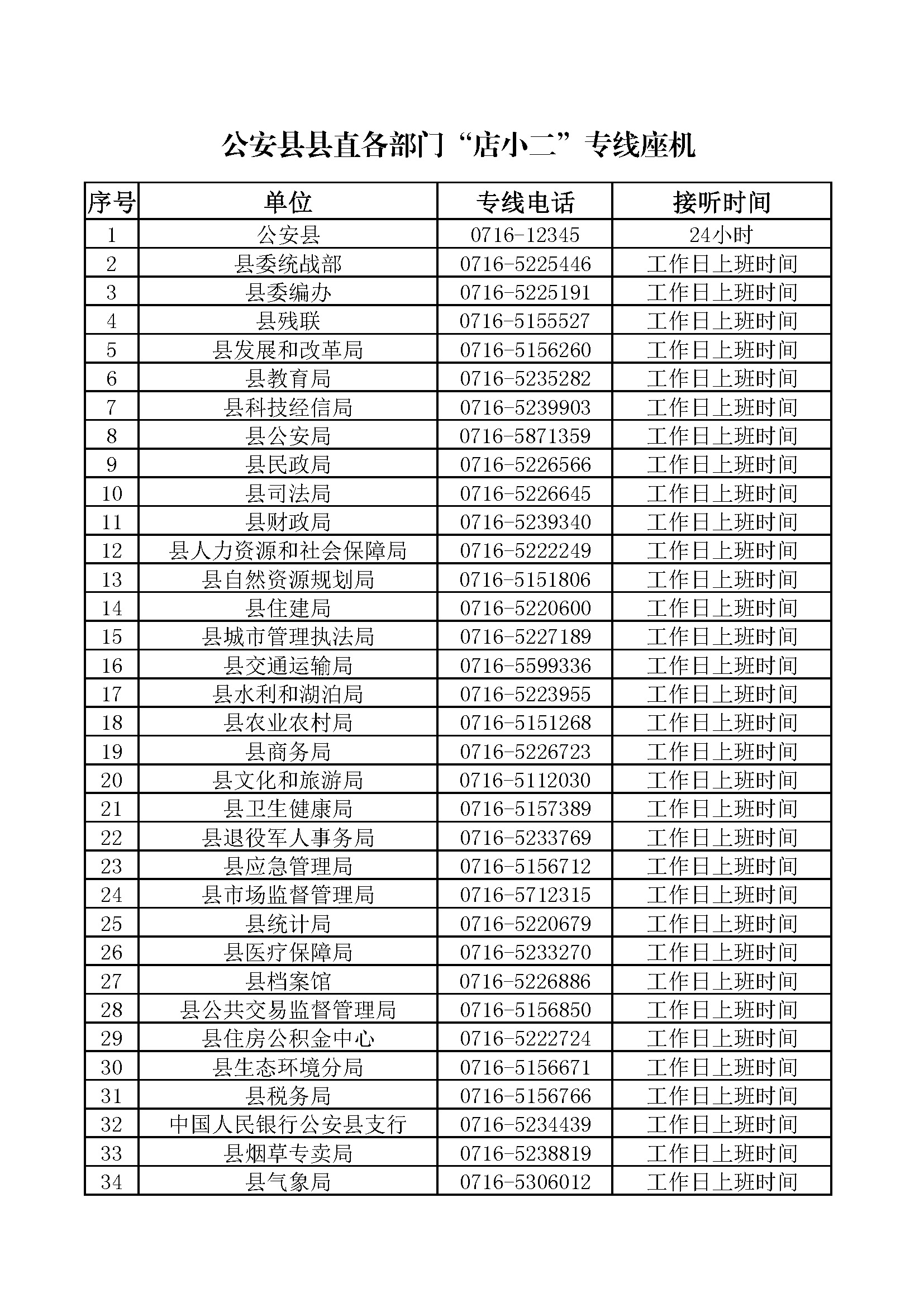 為進一步踐行“有呼必應、無事不擾”的“店小二”精神,暢通企業(yè)群眾訴求表達渠道,確保企業(yè)群眾咨詢高效辦理,提升企業(yè)群眾滿意度和獲得感,根據(jù)《省優(yōu)化營商環(huán)境領導小組關于建立“店小二”專線服務工作機制的通知》(鄂營商發(fā)〔2021〕5號)精神,公安縣各鄉(xiāng)鎮(zhèn)(街道)、縣直各部門設立了“店小二”專線,實現(xiàn)一個部門一個號碼統(tǒng)一為企業(yè)群眾提供服務?,F(xiàn)將我縣“店小二”服務專線向社會集中公布如下。