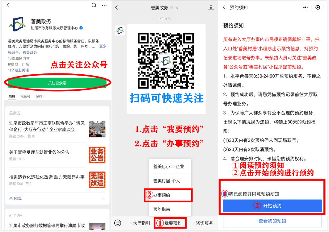 有辦事需求的企業(yè)、群眾可搜索、掃碼關注“善美政務”微信公眾號或“善美村居”“粵省事”小程序提前進行預約。