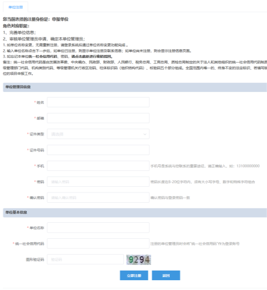 (1)打開網(wǎng)頁后,點擊單位注冊,填寫單位管理員和單位基本信息。