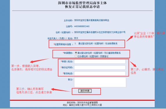 進入申報信息詳細頁面,選擇申請理由:1.【通過登記的住所(經(jīng)營場所)可以重新取得聯(lián)系】填寫申請人姓名、身份證號碼、聯(lián)系電話、備注信息。如下圖所示: