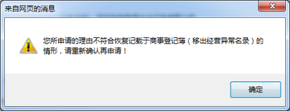 如果系統(tǒng)查詢【已辦理住所(經(jīng)營場所)變更登記】不屬實的,提示您申請的理由不成立,請查證后再申請。如下圖所示: