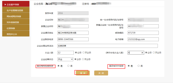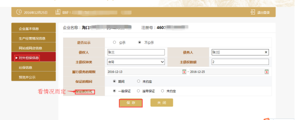第七步:填寫“對外提供保證擔保信息”。對外提供保證擔保信息是指截止到年報年度有效的擔保信息,該信息為非強制性公示的事項,企業(yè)可自行選擇是否向社會公示。如企業(yè)當年度無對外提供保證擔保信息,則無需填報,直接點擊“保存”即可。