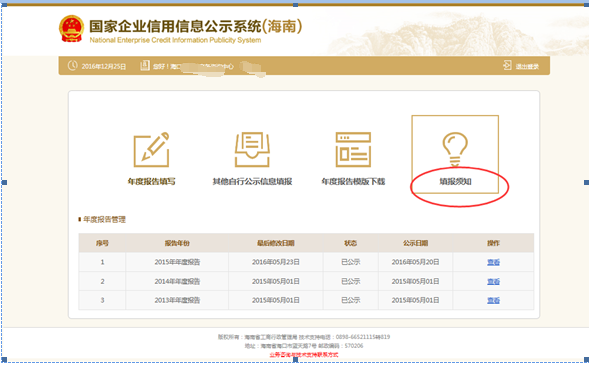 第一步:登陸海南企業(yè)信用信息公示系統(tǒng)首頁(yè)(入口地址:http://m.51gecaochuan.cn/shop/9697.html)。填報(bào)年報(bào)公示信息前,請(qǐng)先閱讀“在線填報(bào)須知”。