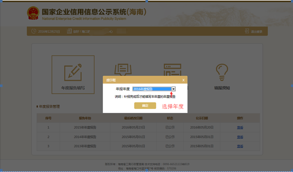 第二步:選擇填報(bào)年度。如往年未填報(bào),須先補(bǔ)報(bào),再報(bào)送2016年度的年報(bào)。