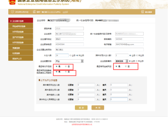 第四步:進(jìn)入填報(bào)頁(yè)面。企業(yè)根據(jù)實(shí)際情況選擇“是否有網(wǎng)站或網(wǎng)店”、“企業(yè)是否有投資信息或購(gòu)買其他公司股權(quán)”,如選擇“是”,則必須填寫“網(wǎng)站或網(wǎng)店信息”、“對(duì)外投資信息”。