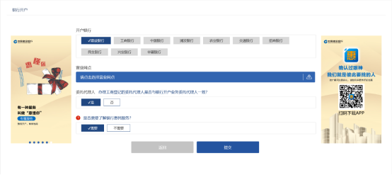 5、申請人需填寫委托代理人身份信息及身份證明材料,點(diǎn)擊【提交】按鈕后,您的開戶申請成功。系統(tǒng)將自動將信息推送給相關(guān)銀行,稍后會有銀行業(yè)務(wù)人員主動與您聯(lián)系。