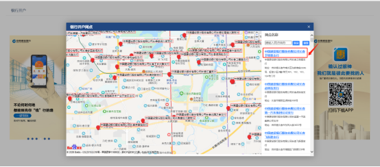 3、確定開戶銀行之后,需要選擇營業(yè)網(wǎng)點(diǎn)。點(diǎn)擊后系統(tǒng)會彈出所有受理網(wǎng)上開戶申請的銀行網(wǎng)點(diǎn),申請人可以在地圖上選擇就近網(wǎng)點(diǎn)。如下圖: