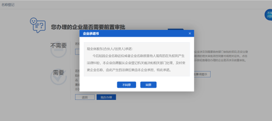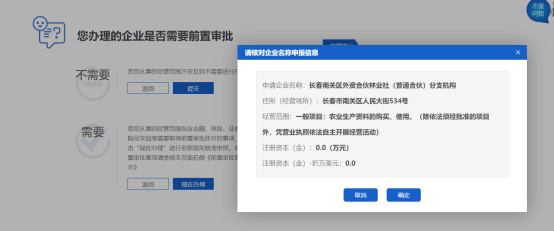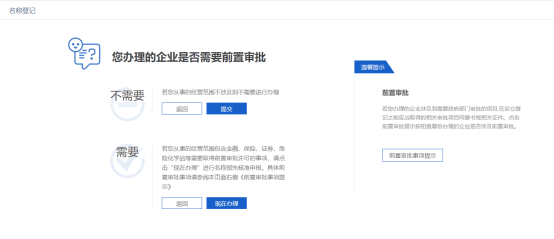 8. 根據(jù)自己行業(yè)需業(yè)“您辦理的企業(yè)是否需要前置審批”,本例為不需要,直接點擊“提交”按鈕,如下圖: