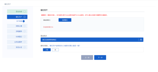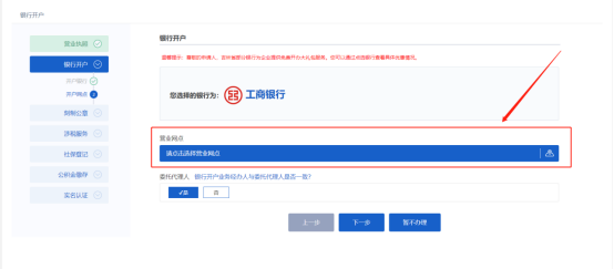 21) 選擇就近網(wǎng)點(diǎn),雙擊后選擇銀行開戶業(yè)務(wù)經(jīng)辦人與委托代理人是否一致,如果一致直接點(diǎn)擊下一步進(jìn)入刻制公章頁面,如不一致選擇“否”進(jìn)入委托人頁面如下圖: