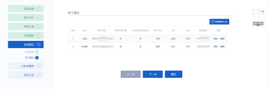 33) 完善信息后選擇辦理企業(yè)參保的經(jīng)辦人與委托代理人是否一致,如不一致選擇“否”進(jìn)入委托人頁(見銀行開戶業(yè)務(wù)委托代理人)如一致點(diǎn)擊“下一步”進(jìn)入員工登記頁面,如下圖:
