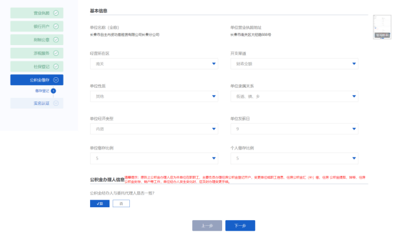 35) 完善信息后選擇公積金經(jīng)辦人與委托代理人是否一致,如不一致選擇“否”進(jìn)入委托人頁(見銀行開戶業(yè)務(wù)委托代理人)如一致點(diǎn)擊“下一步”進(jìn)入企業(yè)開辦領(lǐng)取信息頁,如下圖: