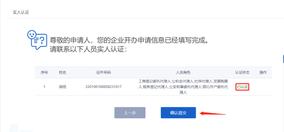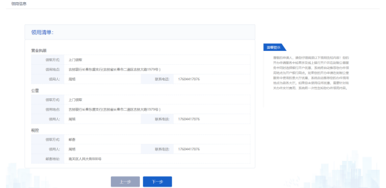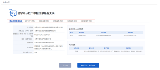 36) 企業(yè)根據(jù)回顯的領(lǐng)用清單到相對應(yīng)的部門領(lǐng)取開辦的辦件,點(diǎn)擊下一步進(jìn)入申報信息確認(rèn)頁,如下圖: