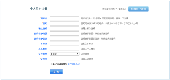 如果沒(méi)有注冊(cè)過(guò)賬號(hào),點(diǎn)擊“注冊(cè)”按鈕,進(jìn)入注冊(cè)賬號(hào)頁(yè)面。注冊(cè)頁(yè)面可提供個(gè)人用戶注冊(cè)和機(jī)構(gòu)用戶注冊(cè)。