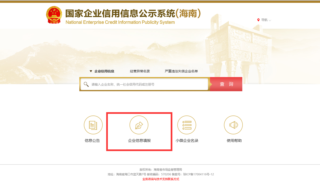 進(jìn)入國家企業(yè)信用信息公示系統(tǒng)(海南)后,點擊“企業(yè)信息填報”。