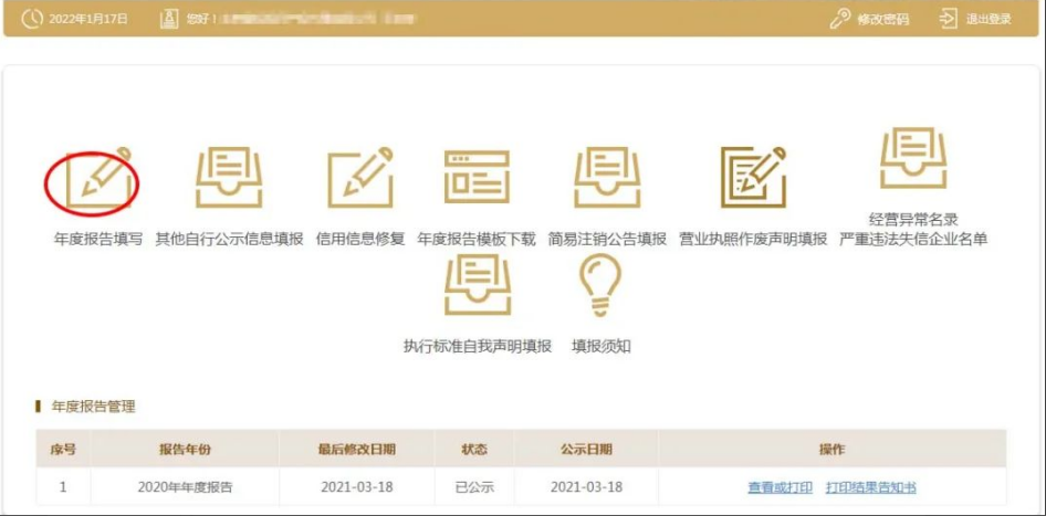(1)點擊左上角“年度報告填寫”。