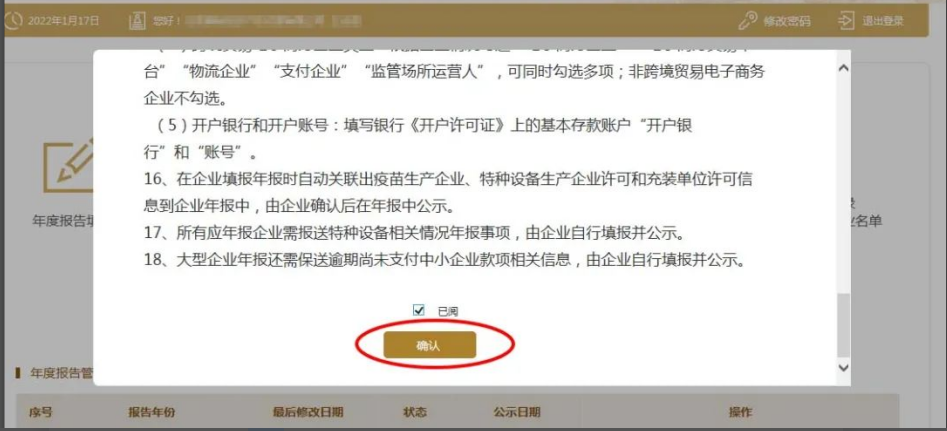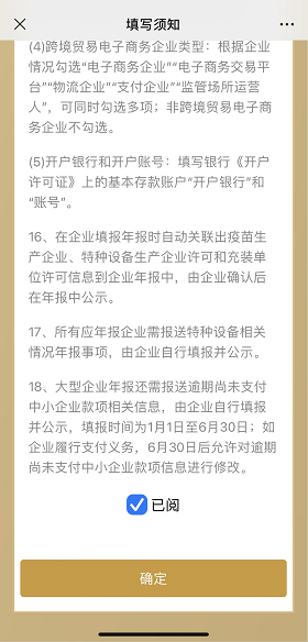 (2)彈出年報須知,閱讀后,點擊下方“已閱”前的小方框,再點確認(rèn)。