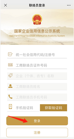 在頁面中輸入統(tǒng)一社會信用代碼/注冊號、工商聯(lián)絡(luò)員證件號碼、短信驗證碼,點擊登錄。