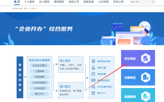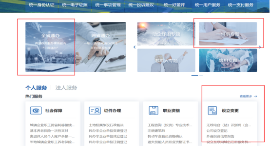 4.找到企業(yè)設立變更專區(qū)【可選擇全省通辦、一件事專題、個人服務中設立變更模塊】