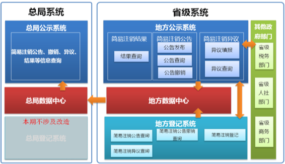 通過對總局及地方相關(guān)系統(tǒng)改造,完成對企業(yè)簡易注銷登記業(yè)務(wù)的技術(shù)支撐工作。涉及的相關(guān)系統(tǒng)包括: