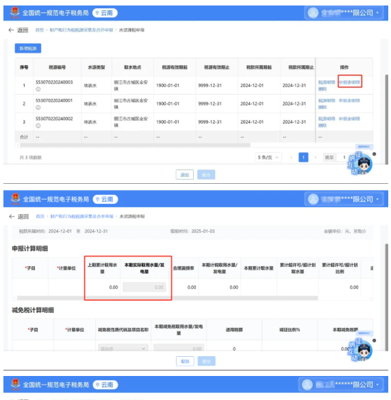 采集完成后,可點擊【申報表明細】進入申報頁面,該頁面主要涉及填寫信息為“本期實際取水量/發(fā)電量”相關(guān)數(shù)據(jù),需根據(jù)實際取水量/發(fā)電量情況進行數(shù)據(jù)錄入。2025年1月做首次申報時,即申報2024年12月或2024年四季度稅款時,需自行填寫“上期累計取水量”數(shù)據(jù);申報2025年及以后所屬期稅款時,該數(shù)據(jù)無需且不允許自行填寫。若存在符合條件的減免稅情形,可在申報頁面【減(免)稅計算明細】表中選擇適用的減免性質(zhì)及代碼,錄入對應(yīng)用水量、發(fā)電量相關(guān)數(shù)據(jù),系統(tǒng)會自動進行減免計算。全部信息錄入完成,且核對無誤后即可點擊【提交】。