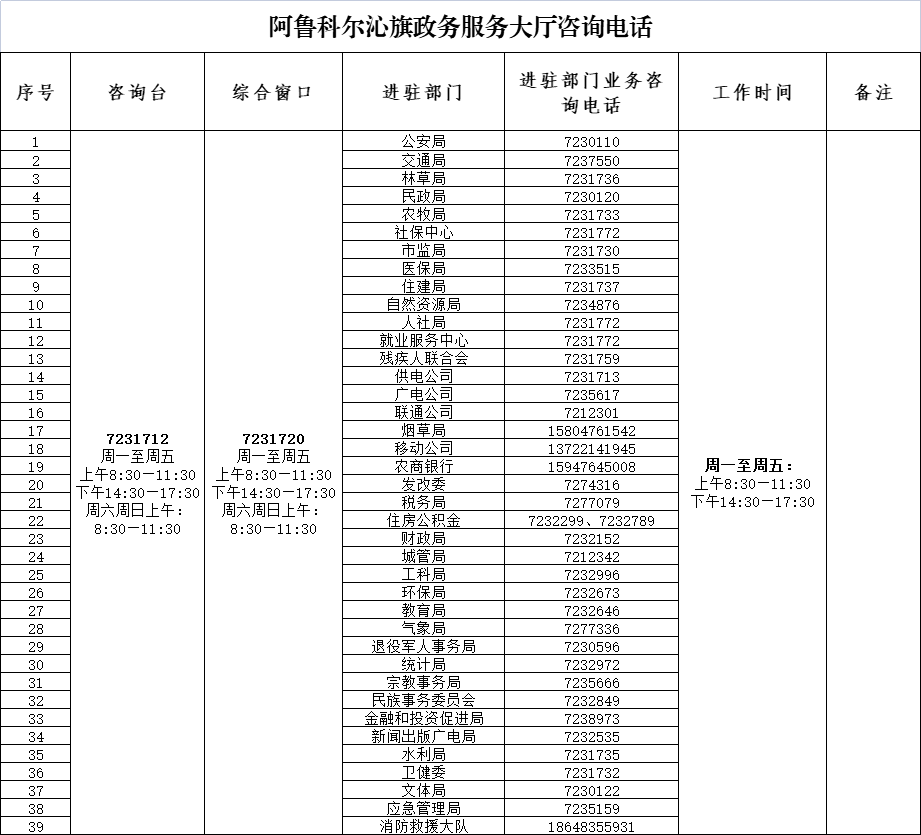 為全面做好我旗政務(wù)服務(wù)工作,打造更優(yōu)營商環(huán)境,為辦事群眾提供高效便捷的服務(wù),現(xiàn)將阿魯科爾沁旗政務(wù)服務(wù)大廳各業(yè)務(wù)部門咨詢電話進行公示。
