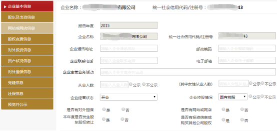 本頁填寫企業(yè)年報年度中的基本信息,企業(yè)需要根據(jù)自己的實際情況如實填寫,其中“是否有網(wǎng)站或網(wǎng)店”、“企業(yè)是否有投資信息或購買其他公司股權(quán)”、“有限責任公司本年度是否發(fā)生股東股權(quán)轉(zhuǎn)讓”,如果選擇“否”,則后面對應的標簽頁將隱藏。