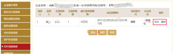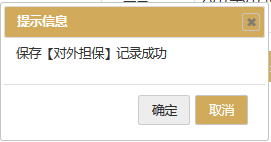 1)點擊“添加”按鈕,彈出編輯窗口,填寫時要選中該條記錄,企業(yè)如實填寫年報年度內(nèi)企業(yè)對外提供保證擔(dān)保信息,點擊“保存”按鈕,彈出保存成功的界面,點擊“確定”后頁面自動關(guān)閉。