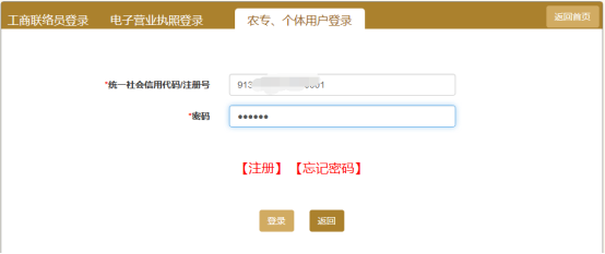 1)已注冊用戶,在用戶名中輸入“企業(yè)注冊號”或“統(tǒng)一社會信用代碼”。