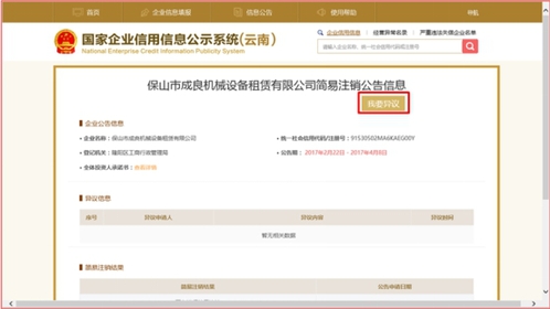第四步:點(diǎn)擊“我要異議”按鈕,之后進(jìn)入企業(yè)簡(jiǎn)易注銷公告頁面,再次點(diǎn)擊“我要異議”按鈕。