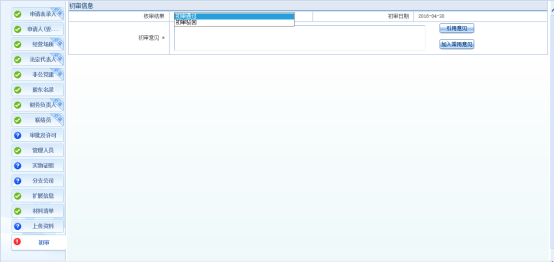 設(shè)立登記初審界面,需工商人員選擇對(duì)應(yīng)的【行業(yè)類型】,點(diǎn)擊左側(cè)【初審】,進(jìn)入初審界面,如圖44: