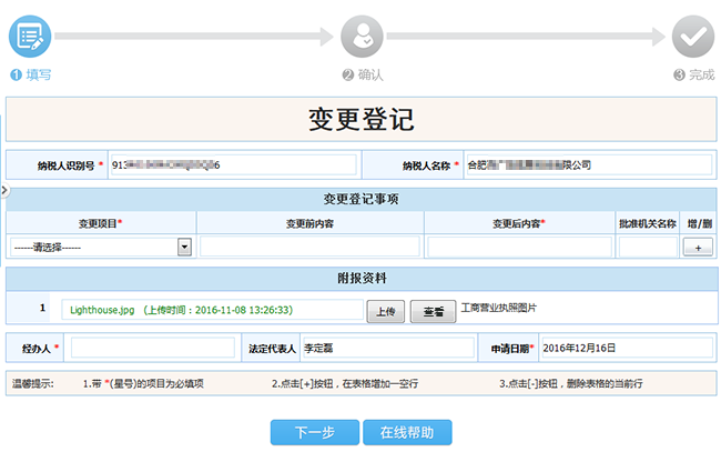 選擇“變更項目”下拉框,“變更前內容”從稅局返回到輸入框中,實現(xiàn)免填;在“變更后內容”輸入框輸入:將要變更的內容;在“批準機關名稱”輸入框中輸入:批準變更的批準機關名稱;如果多個事項需要進行變更,則需要點擊