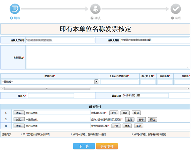 按照【發(fā)票辦理】—【預(yù)申請(qǐng)類】—【印有本單位名稱發(fā)票核定】的路徑進(jìn)入該功能模塊,進(jìn)入模塊后。如圖3.3.7-1所示。