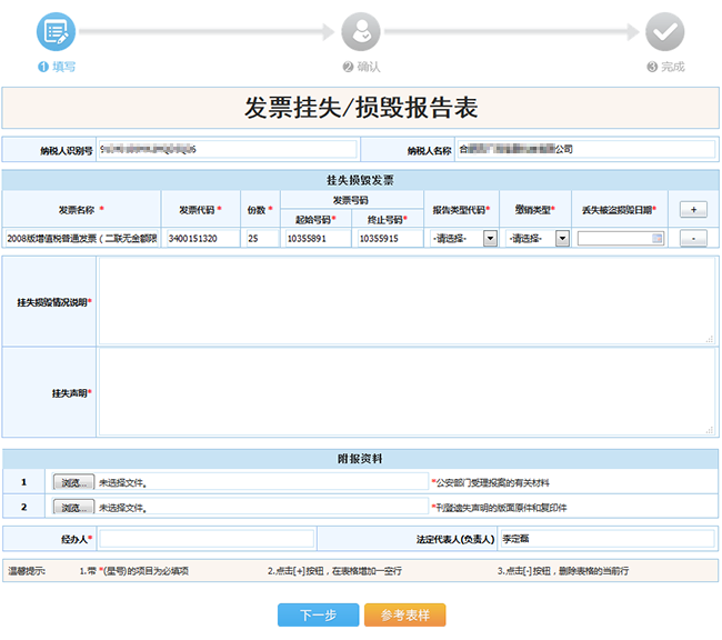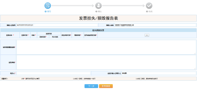 在“掛失損毀情況說(shuō)明”輸入框輸入:情況說(shuō)明;在“掛失聲明”輸入框輸入:掛失聲明。