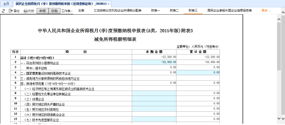 本期金額列,輸入營業(yè)收入、營業(yè)成本、利潤總額、特定業(yè)務計算的應納稅所得額、特定業(yè)務已預繳(征)稅款。累計金額列,輸入實際已預繳所得稅額。其他項目自動計算。