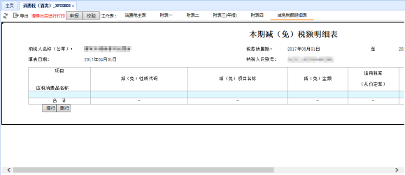 選擇應稅消費品名稱、減免性質(zhì)代碼、減免項目名稱,輸入減免金額與適用稅率(從價定率),或者減免數(shù)量、適用稅率(從量定額)。合計行自動計算。