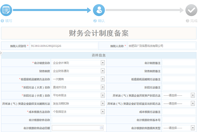 在“會計制度名稱”下拉框中選擇符合公司的會計制度;在“財務(wù)制度”下拉框中選擇符合公司的財務(wù)制度;在“低值易耗品攤銷方法名稱”下拉框中選擇其中一個攤銷方法;在“折舊方法(大類)名稱”和“折舊方法(小類)名稱”下拉框中選擇其中一個折舊方法;在“開采油(氣)資源企業(yè)開發(fā)資產(chǎn)折舊方法” 下拉框中選擇其中一個折舊方法;在“開采油(氣)資源企業(yè)開發(fā)資產(chǎn)勘探支出攤銷方法” 下拉框中選擇其中一個攤銷方法;在“開采油(氣)資源企業(yè)礦區(qū)權(quán)益支出折耗方法” 下拉框中選擇其中一個折耗方法;在“成本核算方法名稱”下拉框中選擇其中一個核算方法;在“會計核算軟件名稱”文本框中輸入軟件名稱;在“會計核算軟件版本號”文本框中輸入軟件版本號;在“會計核算軟件啟動日期”點擊“