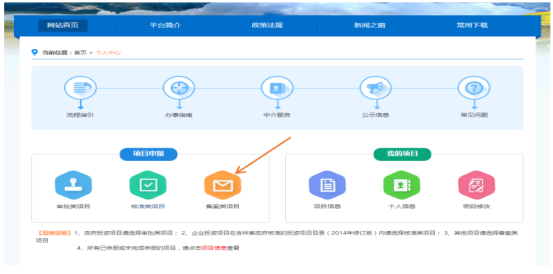 2.填寫備案申請表。成功登錄后,進(jìn)入“個(gè)人中心”界面,如下圖。在“項(xiàng)目申報(bào)”區(qū)域,點(diǎn)擊備案類項(xiàng)目,打開《吉林省企業(yè)投資項(xiàng)目備案申請表》頁面,按要求如實(shí)填寫項(xiàng)目情況,填寫無誤后,點(diǎn)擊“信息確認(rèn)”按鈕。