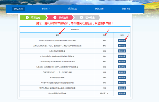 3.事項(xiàng)選擇。提交項(xiàng)目基本信息后,開始進(jìn)行事項(xiàng)選擇,如選擇申報(bào)“礦泉水項(xiàng)目備案”或“玉米深加工項(xiàng)目備案”等事項(xiàng),同時(shí)注意層級(省、市、縣(區(qū))),確認(rèn)后點(diǎn)擊“確認(rèn)申報(bào)”按鈕,見下圖。