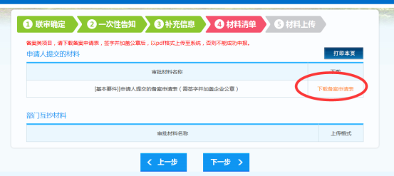 到“材料清單”環(huán)節(jié),單擊“下載備案申請表”按鈕,將填寫好的《吉林省企業(yè)投資項(xiàng)目備案申請表》(表中數(shù)據(jù)是根據(jù)步驟三填寫的備案信息自動(dòng)生成的)電子檔下載并打印出來。企業(yè)法人代表在表格指定區(qū)域內(nèi)簽字并加蓋單位公章后將該表掃描成PDF文檔。