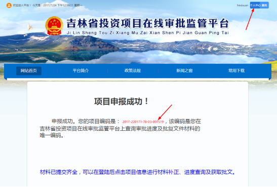 重新登錄平臺(tái),到“材料上傳”環(huán)節(jié),點(diǎn)擊“上傳”按鈕,將帶有法人代表簽字并加蓋公章的《吉林省企業(yè)投資項(xiàng)目備案申請表》電子檔以PDF格式上傳至平臺(tái)(可點(diǎn)擊“查看”按鈕,查看上傳的文件,如文件上傳錯(cuò)誤,可點(diǎn)擊“刪除”按鈕,刪除后重新上傳),確認(rèn)無誤后,單擊“提交”—>“確定”按鈕,平臺(tái)會(huì)提示“申報(bào)成功”,并顯示出項(xiàng)目編碼,至此項(xiàng)目申報(bào)完成。見下圖。