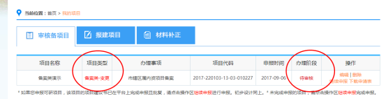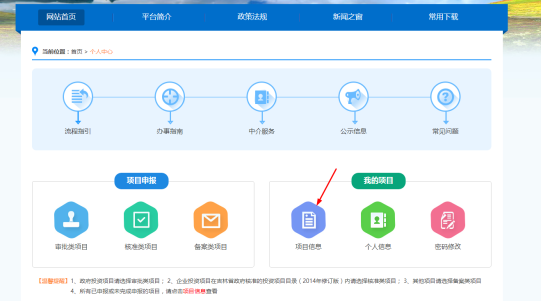 6.查看項(xiàng)目辦理狀態(tài)。項(xiàng)目申報(bào)成功后,請牢記項(xiàng)目編碼并點(diǎn)擊“個(gè)人中心”,回到管理主界面。點(diǎn)擊“項(xiàng)目信息”進(jìn)入“我的項(xiàng)目”列表,可查看項(xiàng)目當(dāng)前的辦理狀態(tài),并且可在“待審核”(該狀態(tài)表示項(xiàng)目為被受理)狀態(tài)下對項(xiàng)目進(jìn)行編輯、修改和刪除操作。見下圖。