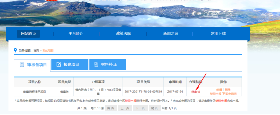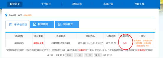 7.備案完成,下載《吉林省企業(yè)投資項(xiàng)目備案登記表》。項(xiàng)目辦結(jié)后,按照步驟一登錄平臺(tái),進(jìn)入“個(gè)人中心”點(diǎn)擊“項(xiàng)目信息”,看到項(xiàng)目的辦理階段為“辦結(jié)”,點(diǎn)擊“下載備案登記表”按鈕,下載《吉林省企業(yè)投資項(xiàng)目備案登記表》。至此,項(xiàng)目申請人操作部分全部完結(jié)。見下圖。