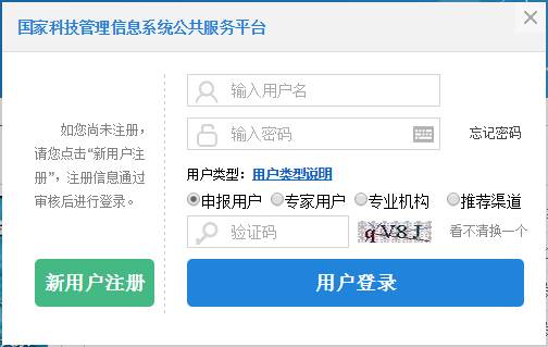 輸入用戶名、密碼及驗(yàn)證碼,選擇申報(bào)用戶,點(diǎn)擊“登錄”按鈕,登錄成功系統(tǒng)彈出相應(yīng)提示,將進(jìn)入國家科技管理信息系統(tǒng)公共服務(wù)平臺(tái)首頁。