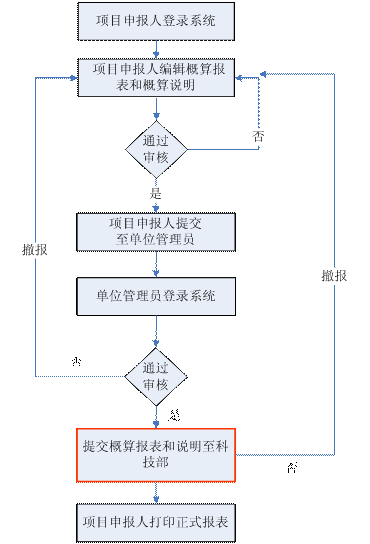 項(xiàng)目申報(bào)人創(chuàng)建項(xiàng)目并編輯概算報(bào)表說(shuō)明提交,提交至單位,單位管理員審核無(wú)誤后提交至科技部,項(xiàng)目申報(bào)人登錄系統(tǒng)打印正式上報(bào)紙件。