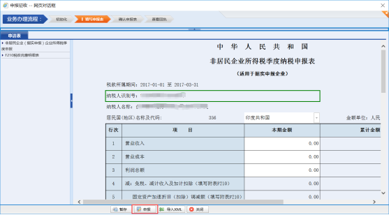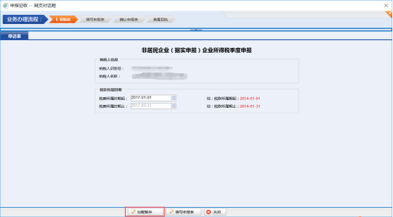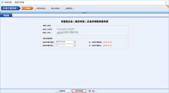 在申報清冊頁面中,選擇“非居民企業(yè)(據(jù)實申報)企業(yè)所得稅季度申報”申報,點擊“進入申報”,進入申報表初始化頁面。