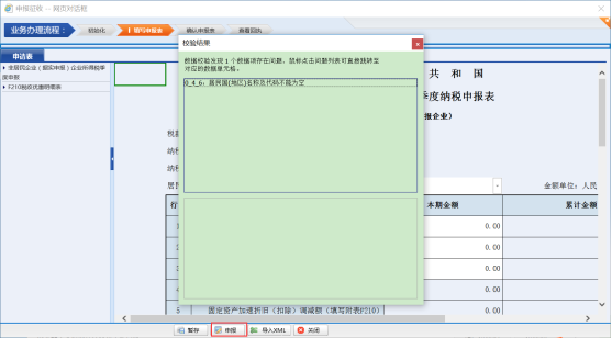 系統(tǒng)顯示填寫申報表頁面,確認納稅人信息以及報送所屬期,點擊【填寫申報表】,操作人員錄入申報數(shù)據(jù),點擊【申報】按鈕系統(tǒng)會自動校驗所填數(shù)據(jù)是否符合校驗規(guī)則,如果數(shù)據(jù)不符合校驗規(guī)則,會提示校驗不通過。操作人員可以根據(jù)提示修改申報數(shù)據(jù)。