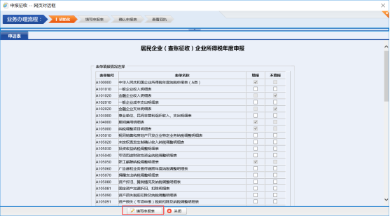 在申報清冊頁面中,選擇“居民企業(yè)(查賬征收)企業(yè)所得稅年度申報”申報,點擊“進入申報”,進入申報表初始化頁面。